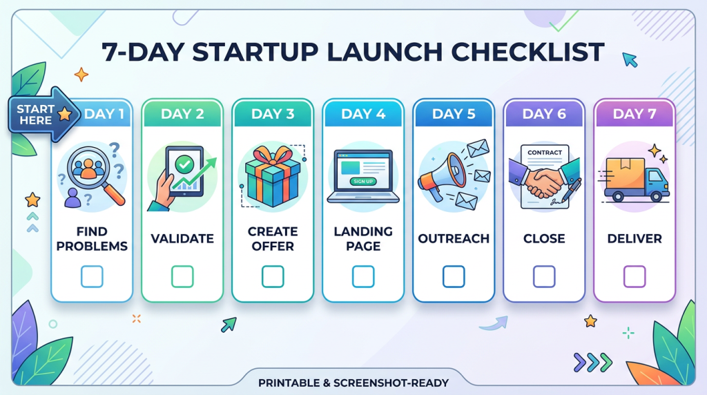 You now have a smart framework: problem-first, embarrassingly simple offers, finding customers without an audience, and scaling only what works. You have the 7-day plan. You have the AI advantage.